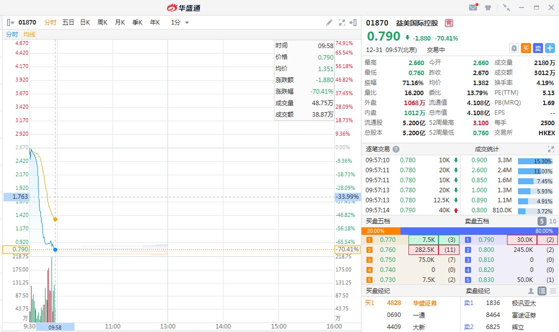 新浪港股讯 12月31日消息,益美国际控股11月8日于联交所挂牌,首日暴涨46.39%。超额配股权已于2019年11月29日失效,截至发稿,益美国际控股暴跌70.41%,报价0.79港元。