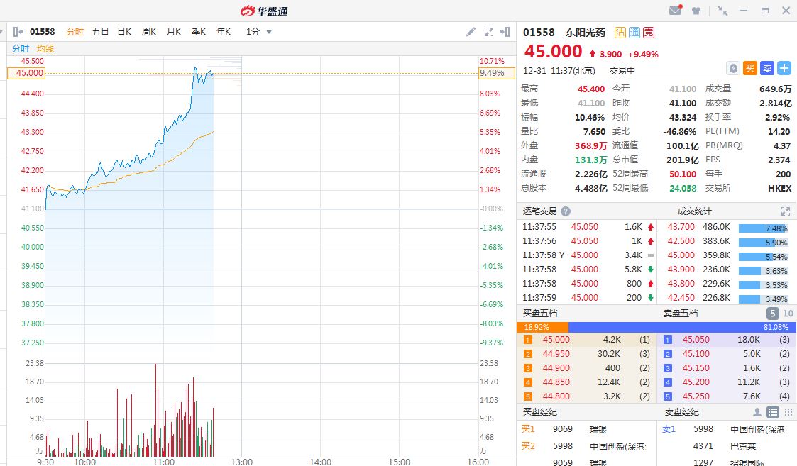智通财经APP获悉,东阳光药(01558)盘中放量飙涨逾10%,突破多条均线。截至11时23分,涨10.34%,报价45.35港元,成交额2.405亿。