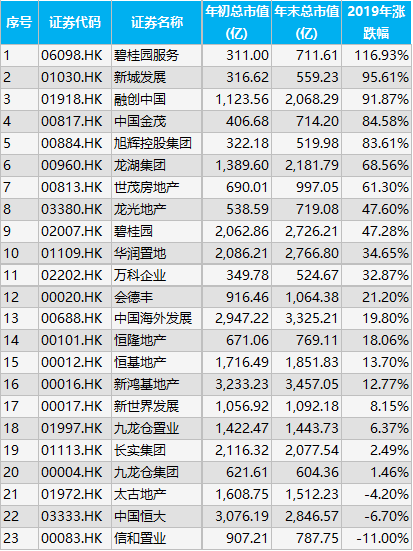 以下为地产行业市值在500亿元以上的公司,2019年的涨跌幅排行榜。(币种:港币)
