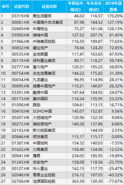 股价表现最差的公司分别是中国地利、力高集团、鹰君、宏安地产、华人置业、易居企业控股、佳源国际控股,全年的股价分别下跌了7.55%、12.52%、19.89%、23.70%、25.47%、43.32%、77.67%,大幅跑输了恒生指数。