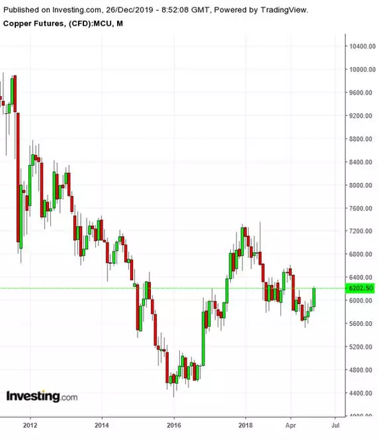 2009年至2019年伦敦铜月线图,来源:英为财情Investing.com