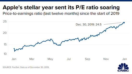 苹果今年的市盈率随股价一起稳步攀升。据FactSet数据显示,苹果今年年初的市盈率略高于13,低于其五年平均值约16,目前已达到24.5。此外,该公司的远期市盈率略低于22点,也达到历史最高水平。