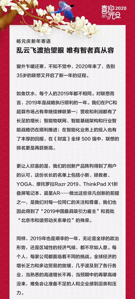 在此,向所有关心和支持联想的合作伙伴和朋友们表示敬意,感谢你们的信任;也祝全体联想人幸福团圆,感谢你们的坚韧。感谢这个冬天,有你们ー起渡过,披坚执锐扬帆起,再踏征程凯歌旋!2020年新年快乐!