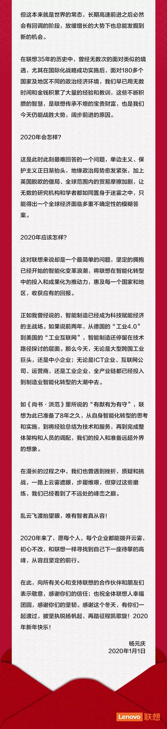 2020年来了:愿每个人,每个企业都能拨开云零,初心不改,和联想一样寻找到自己下ー座待攀的高峰,从容目坚定的前行。