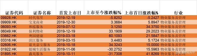 2019年的物业新股堪称香饽饽。在2018年上市的物业股,只有新城悦首日上涨3.79%,其他的首日表现都不太理想。2019年上市的9只物业股,只有时代邻里(09928)一家首日出现下跌。像鑫苑服务、和泓服务首日涨幅在30%以上。