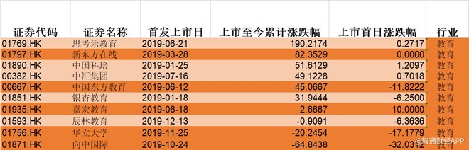 “2019年是内地教育企业的寒冬”、“2019年上市潮不再”……在不少媒体的报道中,2019年的二级市场教育板块情况并不乐观。实际情况并非如此。2019年共有10家教育企业成功赴港IPO,数量与2019年持平。其中有7只股票自发行至今累计上涨,涨幅最高的是思考乐教育(01769),涨幅达190%。整体看来,中国教育企业上市情况比想象的“热”一些。