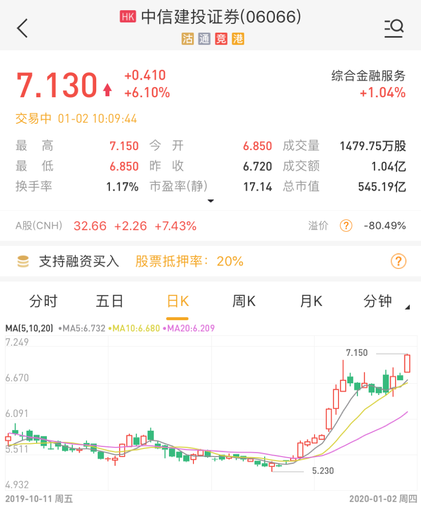 华盛资讯1月2日讯息,2020年首个交易日,中信建投证券盘中异动,股价再创历史新高。截至发稿,中信建投证券大涨6.10%,现报7.13港元,当前成交量1479.75万股,成交额1.04亿港元,当前换手率为1.17%,总市值达545.19亿港元。