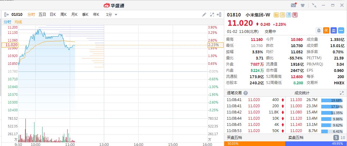 格隆汇1月2日丨小米(1810.HK)今日出现明显上涨,现报11.02港元,涨2.23%,盘中创2019年5月初以来新高,暂成交15.01亿港元,最新总市值2647亿港元。