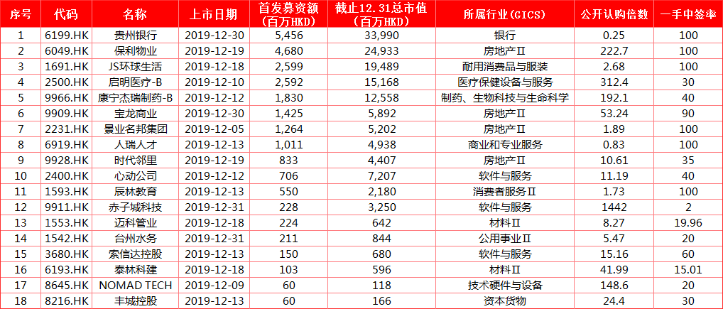 其中赤子城科技以1442倍超额认购荣膺2019香港新股年度超购王,其他超购倍数较高的公司还有312倍的启明医疗、222倍的保利物业、192倍的康宁杰瑞以及148倍的NOMAD TECH。