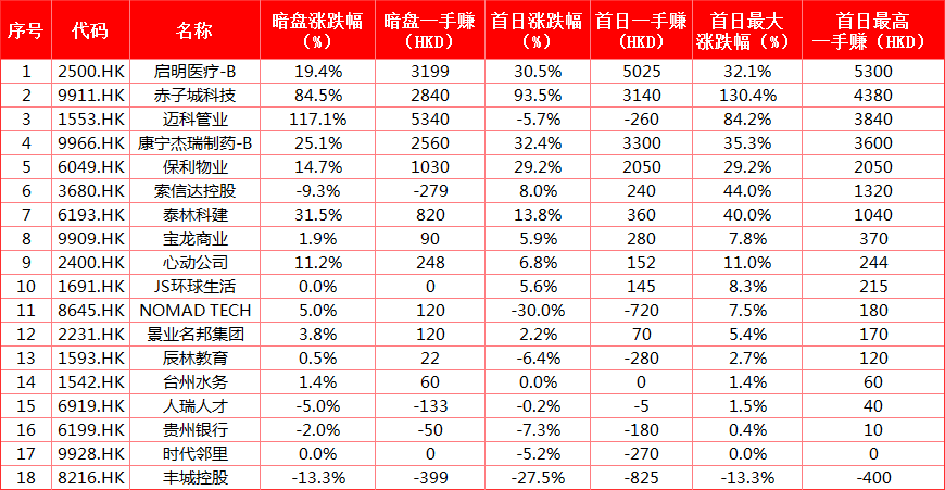如果按照上市首日最大涨跌幅计算,一手赚超100港元的个股数有13只,占总数比超过72%。其中一手收益排名靠前的有启明医疗、赤子城科技、迈科管业、康宁杰瑞制药、保利物业。
