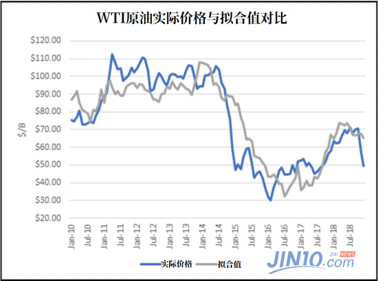 根据上述模型,著名分析网站Seeking Alpha利用EIA在12月短期能源展望中对经合组织库存数据的预测,推断出WTI原油期货价格的未来走势。对比12月10日原油期货的价格,回归分析模型显示油价将在2020年下降,WTI原油到年底将跌至接近45美元/桶的水平。此外,分析指出,如果未来全球原油库存预期发生变化,价格预期也会随之改变,上述预测绝不是一成不变的。