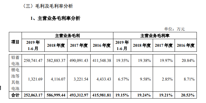 近日,天能股份亦对外披露了招股说明书(申报稿)。2018年,天能股份营收达358.63亿元,净利润(指归属于母公司所有者的净利润,下同)逾12亿元。2019年上半年,公司营收为207.56亿元,净利润为4.68亿元,同比下滑了逾11%,公司资产负债率逾77%。