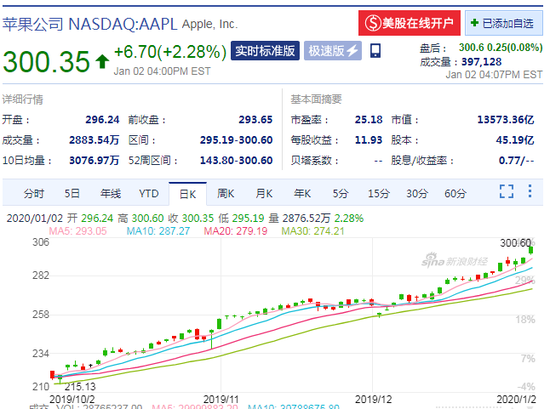 新浪美股1月3日讯 2020年首个交易日,苹果公司股价大涨2.3%,首次突破300美元大关。