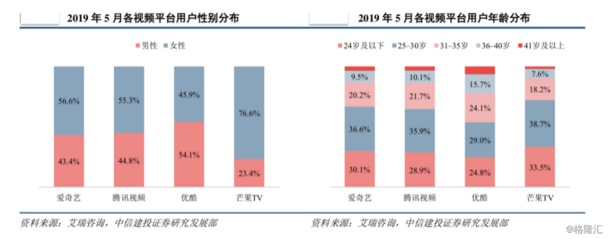 另一组来自艾瑞咨询的数据显示,爱奇艺、腾讯视频用户画像较为相似,活跃用户中女性占 55%以上,芒果 TV也是年轻女性用户居多。
