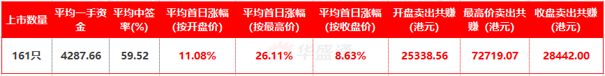 经过计算,在2019年内上市的新股共161只,平均一手中签率为59.52%。如果每只新股都申购一手并且不计算手续费,卖在开盘、最高、收盘价分别可以赚25338.56、72719.07、28442.00港币不等。