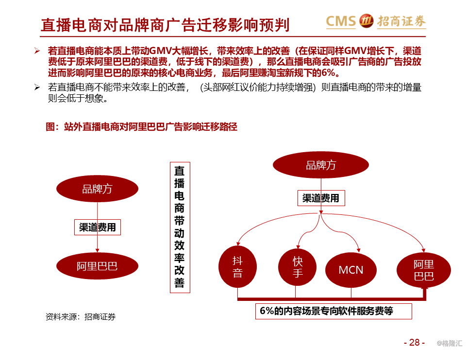 直播电商风口利好拥有供应链的平台方——阿里巴巴:四方利益体角逐,预判供应链>流量>效率集成方;平台>品牌方。阿里巴巴站内直播提升GMV和交易效率,站外淘宝客新规下,阿里将对外部内容平台中产生的淘宝客交易收取交易总金额 * 6%的内容场景专向软件服务费,短期内流量补贴给平台,但长期看第三方内容平台的交易将成为阿里利润丰厚的一块业务。直播作为提升电商人货场效率匹配的一种方式,若能在保证同样GMV增长下带来效率上的改善,则最为利好阿里巴巴。
