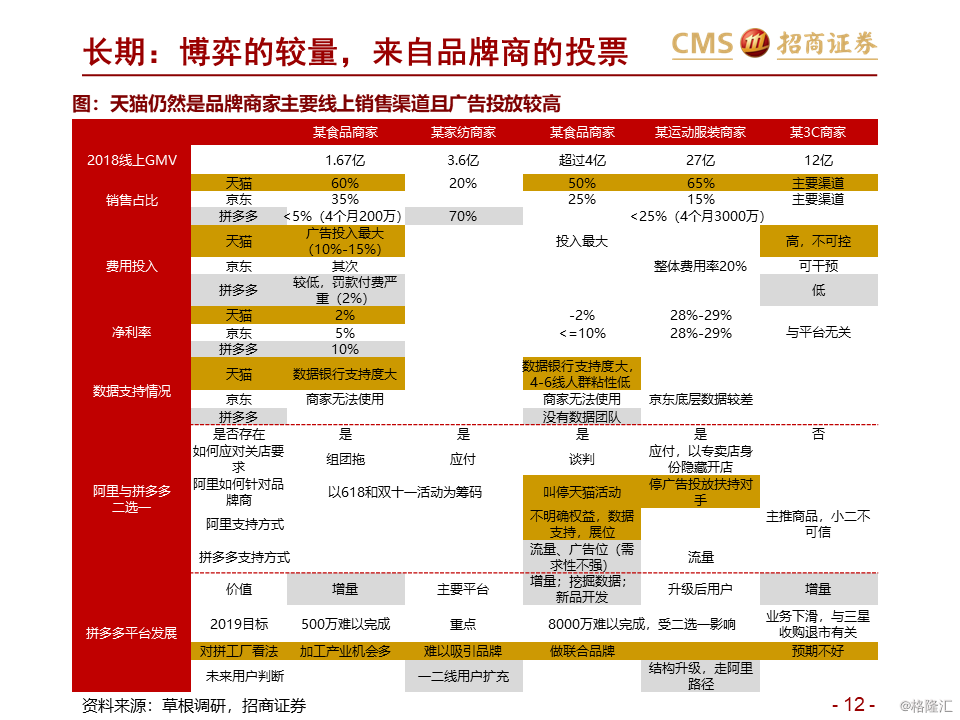 阿里巴巴的竞争格局恶化了吗?短期来看,竞争格局恶化,但阿里巴巴进行了自我革新,我们预判驱动阿里巴巴广告增长的三驾马车如何均衡匹配,广告工具如何更好的嵌入、融合商家生态且不出现大的波动,是阿里巴巴组织架构调整下主要解决的问题和矛盾,架构调整的主要目的是给商家赋能,即在广告费可控的情况下提高转化效果。长期来看,决定平台的盈利水平还是在于品牌方对平台的供应链及广告资源的投放力度,目前各大品牌在拼多多平台盈利能力弱于天猫,且各行业对品牌扶持计划理解不同。拼多多由于平台流量特征的不同,以场景化推荐的方式,和阿里巴巴以搜索推荐为主的流量特征,在广告结构上将走出一定的差异化路径。