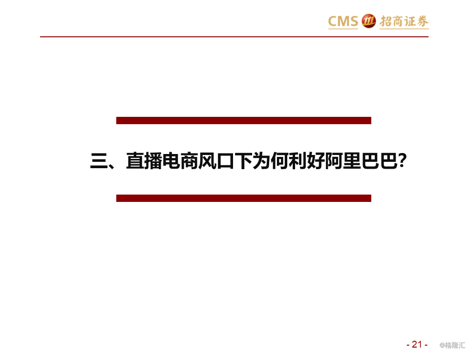 后电商时代,“一超多强”的格局尚未改变,但头部竞争愈加激烈,腾讯从未放弃电商,扶持了围绕阿里巴巴各个线条的竞争对手,形成围绕腾讯和阿里巴巴为主的一超多强,本质上是阿里生态圈和腾讯“朋友圈”的对垒。流量时代转向效率时代,巨头更加讲究用户导向,精细化运营用户以及品牌,以拼多多为代表的场景化推荐方式将加速阿里巴巴向场景化推荐转型。我们预计未来业务方向上也将由货币化率转向GMV导向,配合阿里巴巴B端和C端生态体系,数据银行的中台辅助,以及前端直播平台的快速放量,实现用户ARPU值增长和品牌商户效率提升。