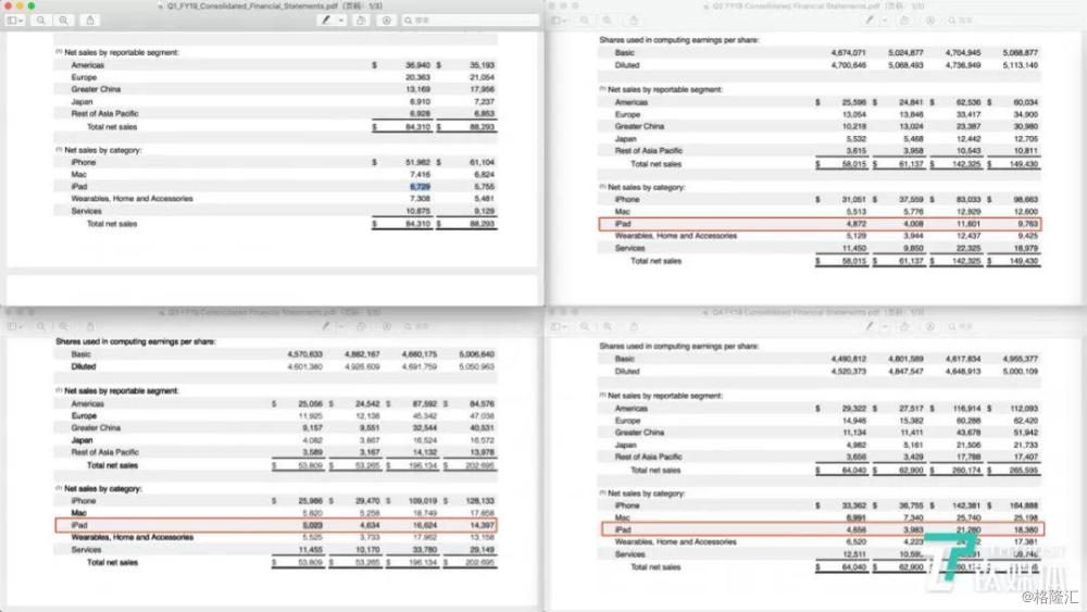 红框部分为iPad销售额,从左到右,从上到下依次为2019年度苹果Q1~Q3财报(数据来源:苹果官网)