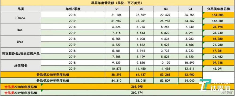 这一招确实换来了Mac销售额的稳定,甚至提振了可穿戴设备和智能家居产品的收入。从上面笔者整理出来的2018年度与2019年苹果各个品类Q1~Q4的营收额数据中,能够很明确地看出来:2019年Mac收入与去年基本持平,仅有2.14%左右的增长;而可穿戴设备和智能家居产品的收入则是出现了40.9%的增长。