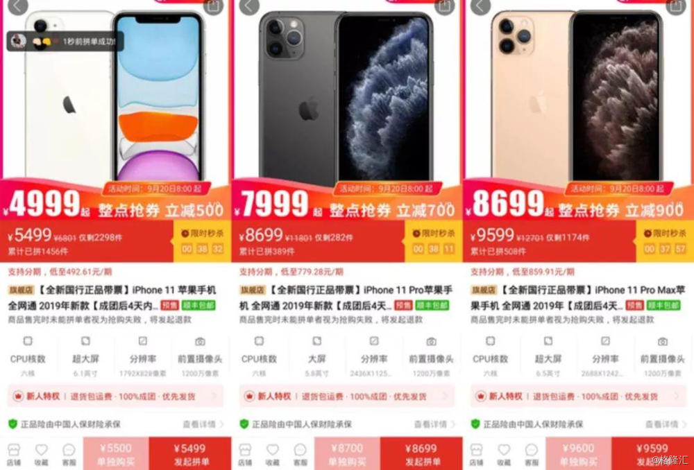 首发就遭遇“破发”的iPhone 11系列产品(图片来源:拼多多)