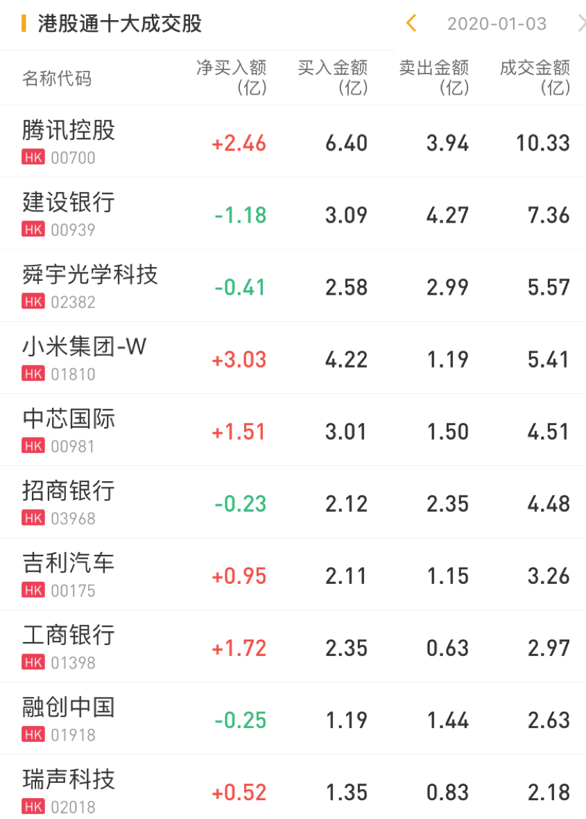 净卖出建设银行1.18亿港元,净卖出舜宇光学科技0.41亿港元。