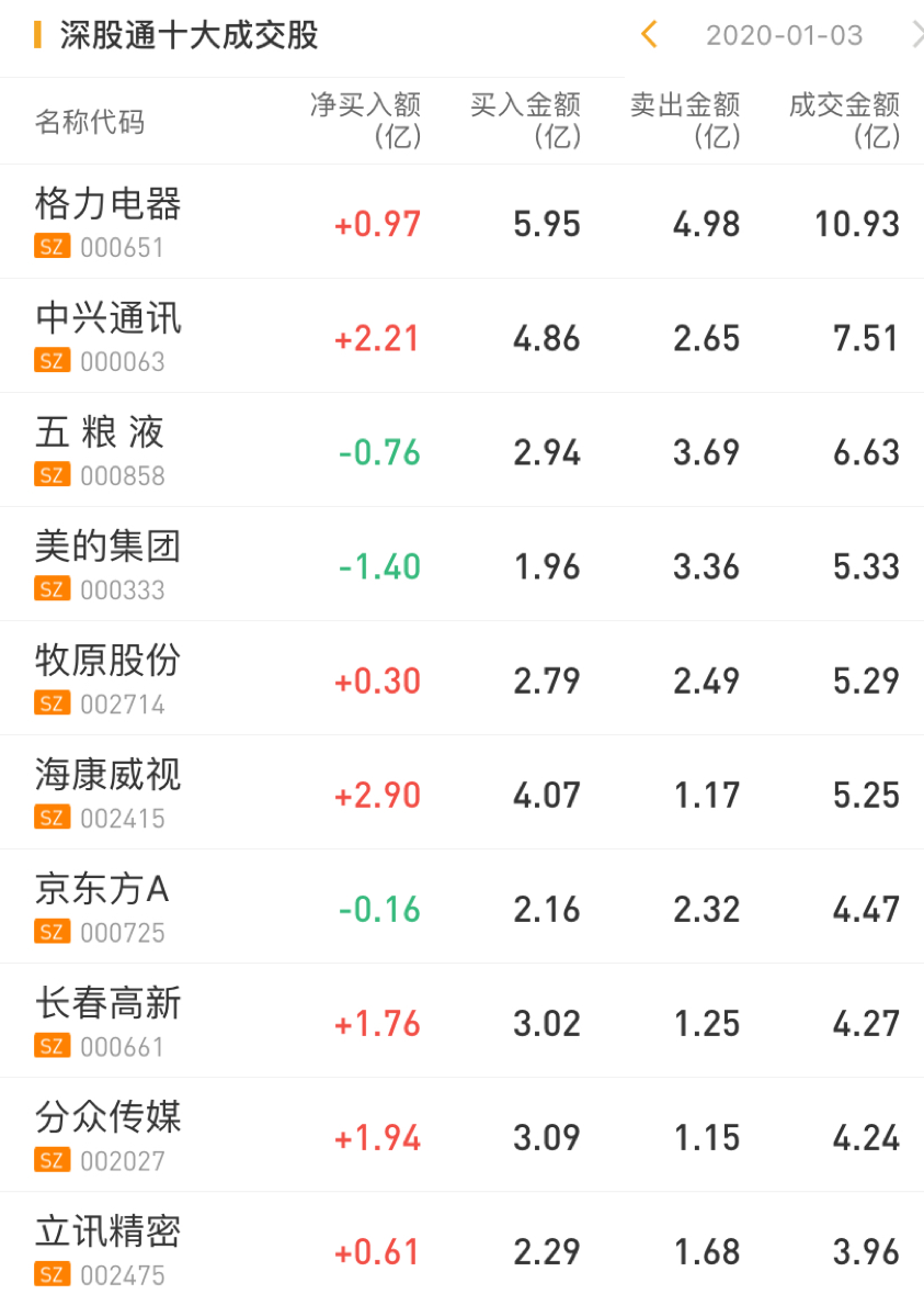 深股通净买入中兴通讯2.21亿元,净买入海康威视2.90亿元,净买入格力电器0.97亿元;净卖出美的集团1.40亿元。