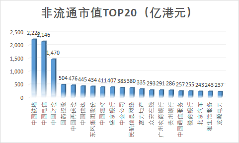 在未流通市值体量来看,中国铁塔、中国电信未流通市值高达2000亿港元以上,中国财险则高达1500亿。银行股、保险股占比较高,其他如国药控股、中金公司、富力地产、北京汽车等未流通市值也较大。
