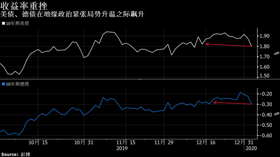 美国10年期国债收益率跌至12月12日以来最低,德国和英国国债上涨。此前美国总统唐纳德·特朗普下令对伊拉克实施空袭,Qassem Soleimani在空袭中丧生。现在,货币市场投资者对美联储2021年1月降息几率的预期已经从周四的80%升至近100%。