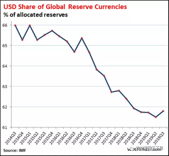 根据国际货币基金组织发布的COFER季度报告,2019年3季度以所有储备货币计价的全球外汇储备环比2季度下降了0.6%,为11.66万亿美元;外国央行持有的包含美国国债、美国公司债在内的美元外汇储备环比下降0.4%,为6.51万亿美元。但是以其他货币标价的外汇储备的跌幅更大,因此美元外汇储备在全球外汇储备中的占比小幅升至61.8%,而2014年美元外汇储备在全球外汇总储备中的占比为66%。