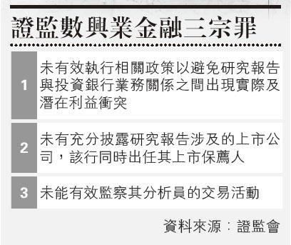 新浪港股讯 据香港明报报道,香港证监会前日(1月2日)公布,上月初传已撤出香港的兴业金融因违反有关利益冲突及监督客户主任的监管规定,遭谴责及罚款640万元。公告指,兴业金融触犯多项涉及发表研究报告的守则,包括未能避免潜在利益冲突、未有充份披露该行同时出任研究对象上市保荐人,以及未能有效监察撰写研究报告的分析员的交易活动。