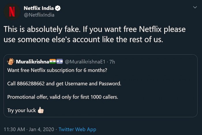 然而这种密码共享行为在全球范围内仍普遍存在,甚至于有些行为明显是虚假、诈骗的,但依然有人会上当受骗。Netflix India在近日发布的推文中强烈嘲讽了这种密码行为,推文中写道:“这显然是假的。对自己好点儿,即便是想蹭账号,也推荐蹭靠谱一点的账号。”
