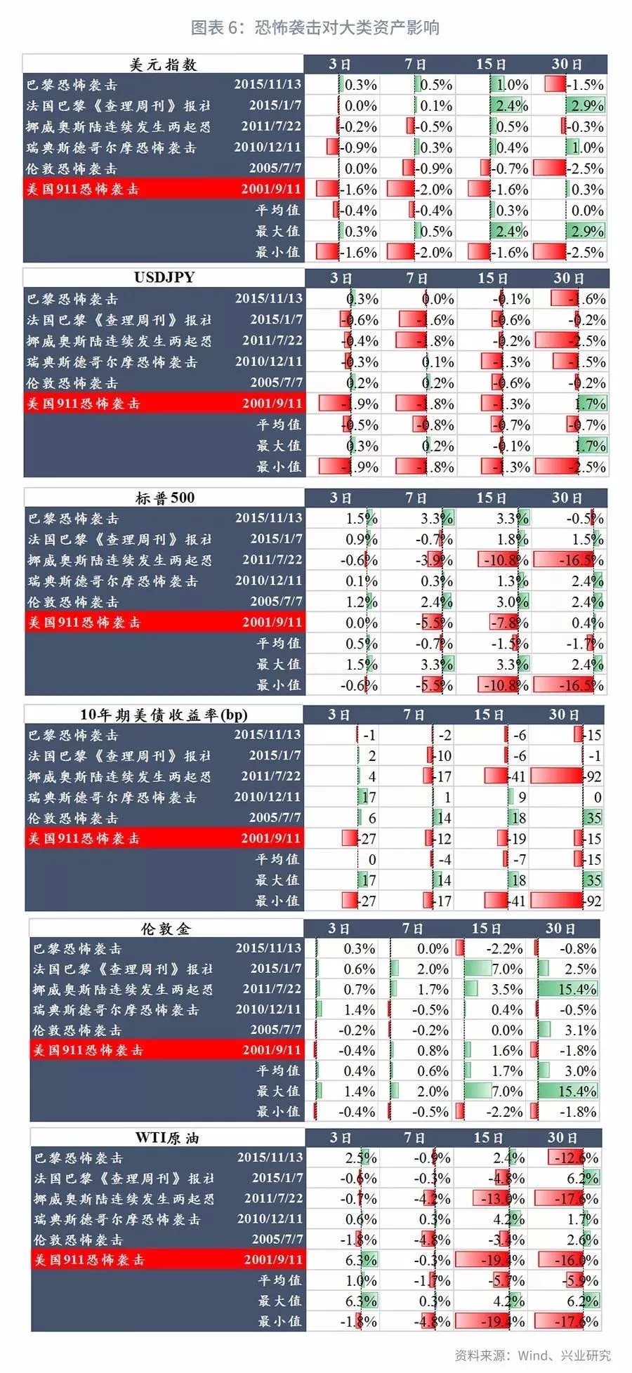 通过上述分析我们可以发现,中东地缘政治局势的紧张并不必然导致市场进入避险模式,大类资产的表现依然更多取决于当时的宏观经济环境和市场所处的趋势。美国直接介入的战争更易使得油价上涨,但其他资产的反应并不明显。若发生类似911的针对美国本土的恐怖袭击,则可能使得市场进入避险模式,而欧洲的恐怖袭击对市场影响有限。