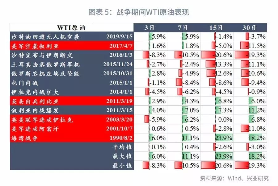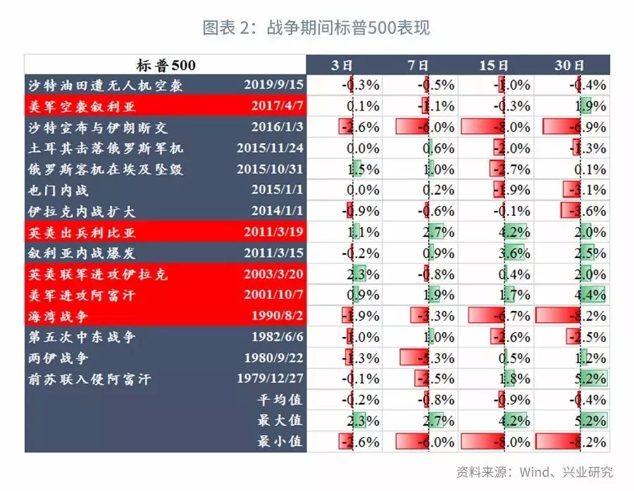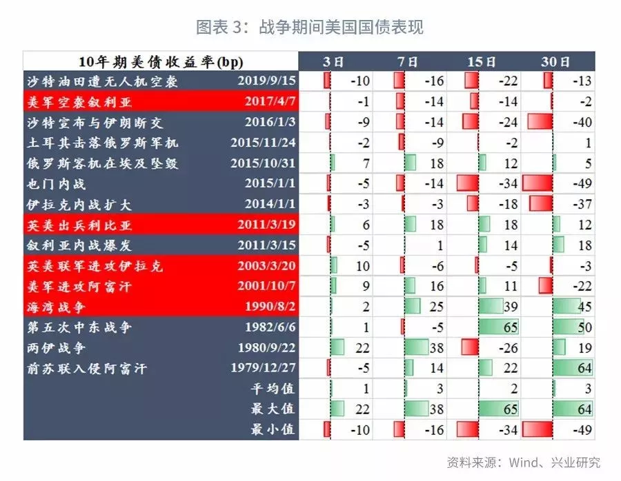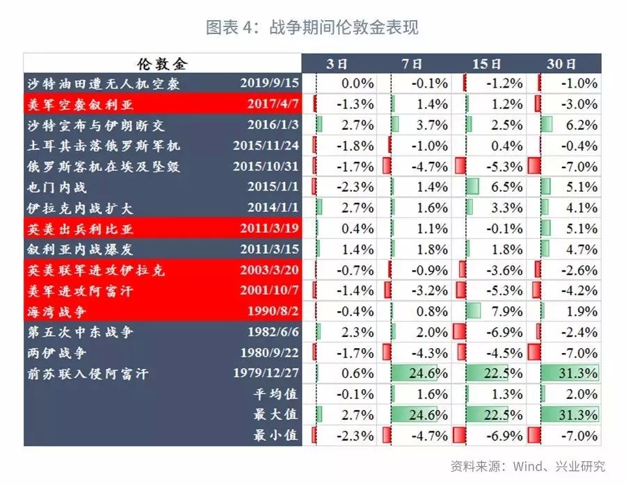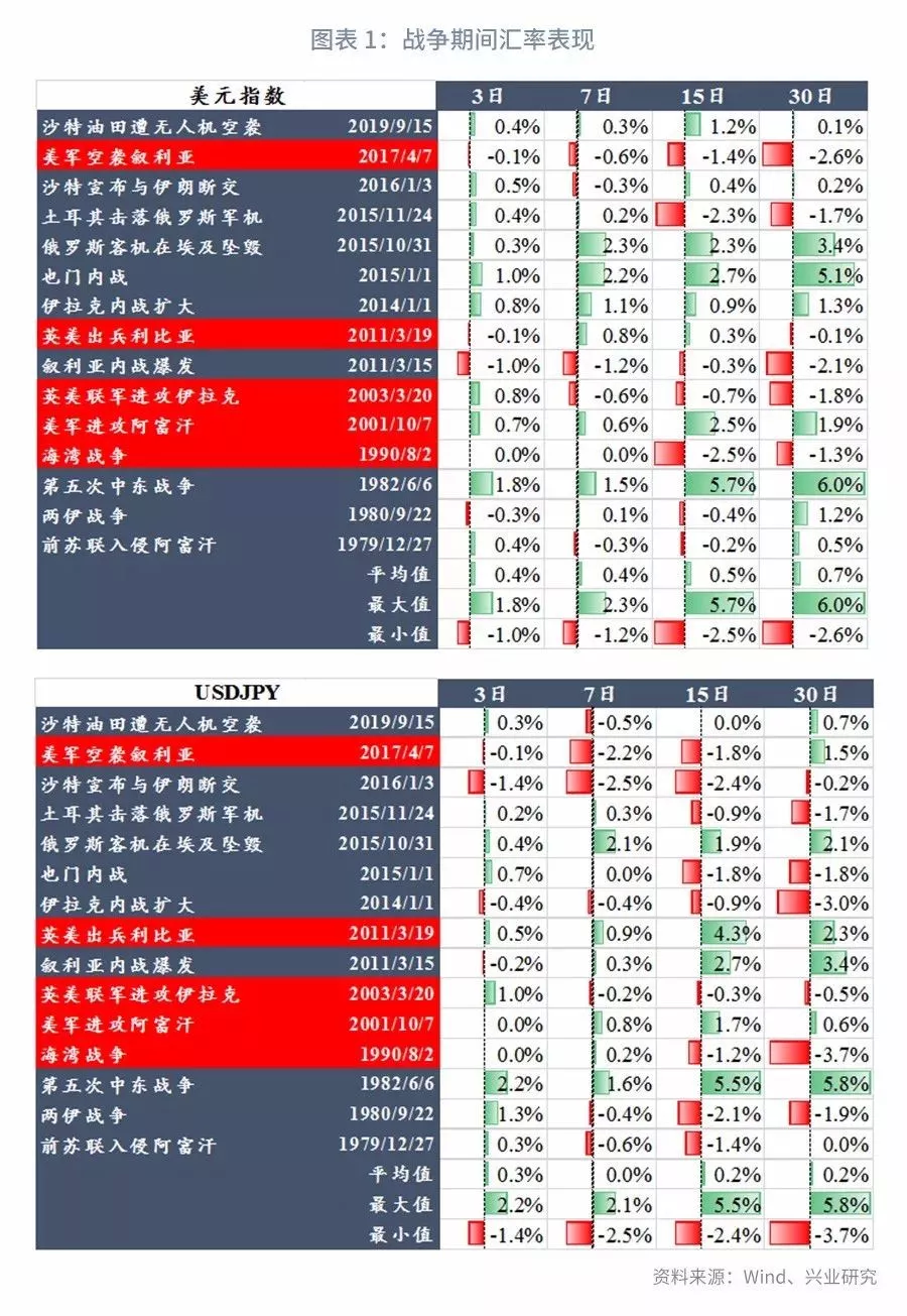 我们主要统计了1979年前苏联入侵阿富汗以来的主要战争爆发后1个月内的美元指数、美元兑日元、标普500、10年期美债收益率、伦敦金和WTI原油的表现。