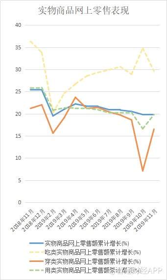 整体来看,2019年纺服行业零售数据整体出现疲弱走势,除行业总体零售增速在社零增速之下外,线上表现也显得差强人意。从全年线上零售数据来看,穿类实物商品增速在多数区间段均处于吃类、用类零售增速下方。