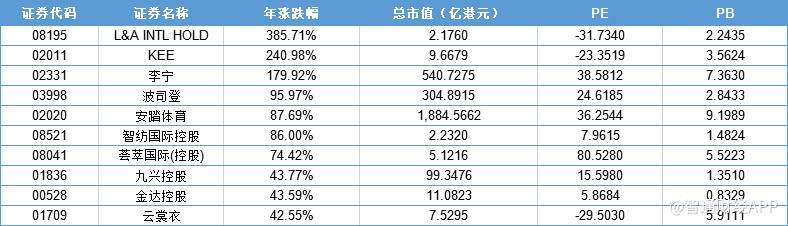 除此之外,李宁、安踏为除拉夏贝尔外港股通持股比例增长最大的公司。其中,两者股价分别实现年涨幅179.92%、87.69%。