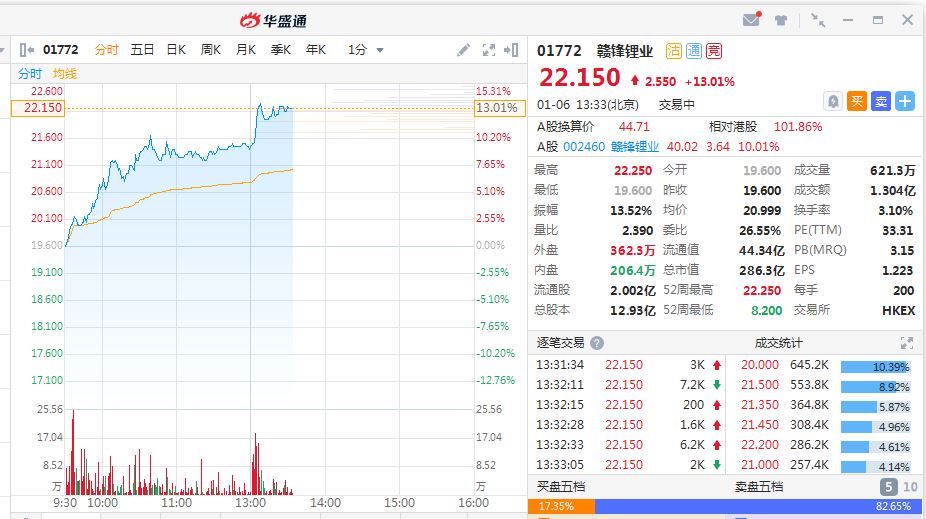 新浪港股讯 1月6日消息,特斯拉概念被热炒,上游原材料是确定性最高的受益者,赣锋锂业AH股集体暴涨。其中,赣锋锂业A股逾5万手封涨停,赣锋锂业H股不断走高,午后涨幅扩大至13.01%,报价22.15港元,市值532亿港元。