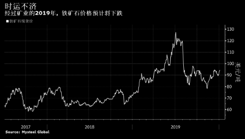 经过动荡的一年,预计铁矿石价格将在2020年下滑。由于巴西淡水河谷溃坝灾难引发供应短缺,铁矿石在2019年创下三年来最大年涨幅。价格在7月触及每吨120美元的高位,年底收在90美元附近,必和必拓等矿业公司股票上涨。