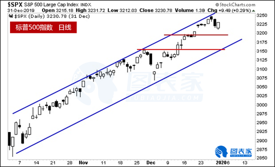 随着标普500指数在整个12月份沿着上升通道持续走高。分析师Graham Summers认为股市在经历了如此大规模的上涨后,理应出现某种程度上的回调,下方较近支撑位为图中红线3175/200附近。