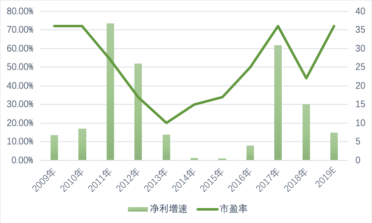 2009-2010年,当市场预期茅台将取得高增长时,茅台市盈率维持在36倍左右。