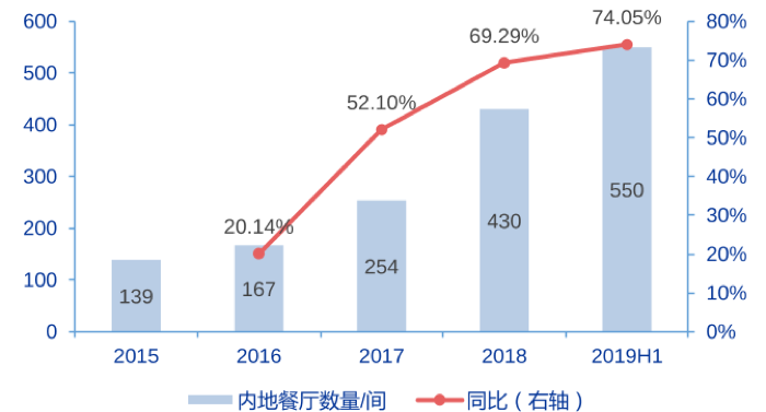 同店数据已经触顶,海底捞只能从门店扩张的道路上取得增长。实际来看,近年来海底捞一直在加速扩张门店,2019H1门店数量更是同比增加74.05%,增速创了新高。