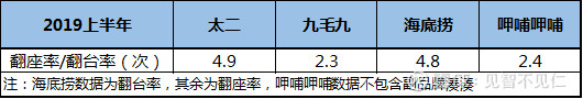 同样堪比海底捞的运营数据是翻台率。2019上半年,太二酸菜鱼的翻座率高达4.9次,而同期海底捞的翻台率为4.8次。值得注意的是,翻座率(注:总客流量除以总运营天数及平均座位数的乘积)的概念比翻台率(注:总桌数除以总运营天数及平均桌数的乘积)更为严谨。
