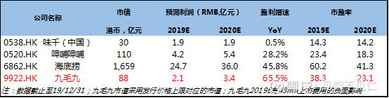 在当前IPO阶段,机构投资者对于九毛九的盈利预测主要基于独家保荐人招银国际出具的定价报告。根据招银国际的预测,九毛九的发行市值(73-88亿港元)对应的2020年归母净利润的19-23倍。