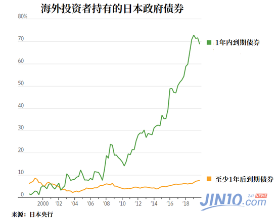 于是乎,不愿放过赚钱机会投资者纷纷购入短期日本国债,继而转换为美元资产。期限在一年或一年以下的票据在日本总体债务中所占的比例有所下降,但外国投资者持有的短期日债比例已从世纪之交的约5%升至今天的逾60%。