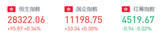 恒指早盘高开126.49点或0.45%,报28352.68点。截至收盘,恒生指数涨95.87点或0.34%,报28322.06点,全日成交额达864.19亿。国企指数涨0.34%,报11198.75点,红筹指数跌0.02%,报4519.67点。