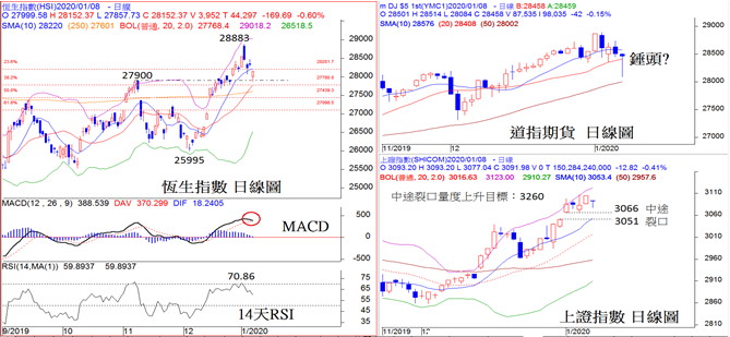 從道指期貨的日線圖看,今早先跌後回穩,暫時呈現「錘頭」的見底形態,假如可以守穩在28400的20天平均線以上的話,「錘頭」形態將有利市況回穩。