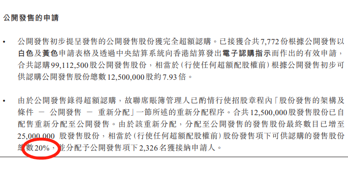 听不懂不用急,举个例子就能明白。2019年的新股德视佳公开发售超购42.72倍,回拨后公开发售使最终占比30%。在配发结果中的描述如下:
