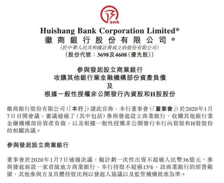 1月7日,徽商银行公告称,拟计划一次性出资不超过人民币36亿元,参与发起新设一家省级地方商业银行,徽商银行持股不超过15%。该商业银行的经营范围、其他参与方及具体持股比例以发起人协议以及监管机构批准为准。