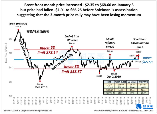 布伦特原油期货近月合约的价格在1月3日苏莱曼尼被杀当天上涨2.35美元至68.60美元/桶,但该合约在前一周下跌了1.91美元至66.25美元/桶。三个月期合约的上涨势头可能已经失去动力。苏莱曼尼的死只是让油价调整回了先前的轨迹。