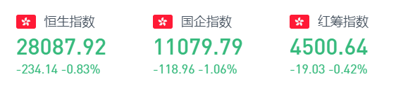恒生指数开盘跌1.14%,全天在二万八关口反复震荡。截至收盘,恒生指数跌234.14点或0.83%,报28087.92点,全日成交额达965.54亿。国企指数跌1.06%,报11079.79点,红筹指数跌0.42%,报4500.64点。